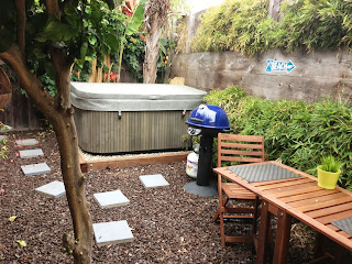 The two bedroom we are in right now it gorgeous. The people next to us look like they live in three containers and they have wine bottle lights hanging from the trees. Anywho... this place has a front gate -wall where you enter through the Pink Panther. We have a front and back porch. We have the whole place to ourselves. The boy has a room to cry it out in and there are two bathrooms too. One of them has a new shower and sink but the other one has original stuff. The stove is really old and original. I have to get a pic of that. It has cupboards for the stove. There is no dish washer or AC in this one. It is a pretty amazing little spot. It is directly across from the skate park and surf spot on Venice beach.. just a few blocks up. I wonder how much it costs? Doesn't matter. We will probably stick to 349. It just felt more like home... but.. I think this one would be good for Allison, Jason, Marcus, and Zoe when they come next time.